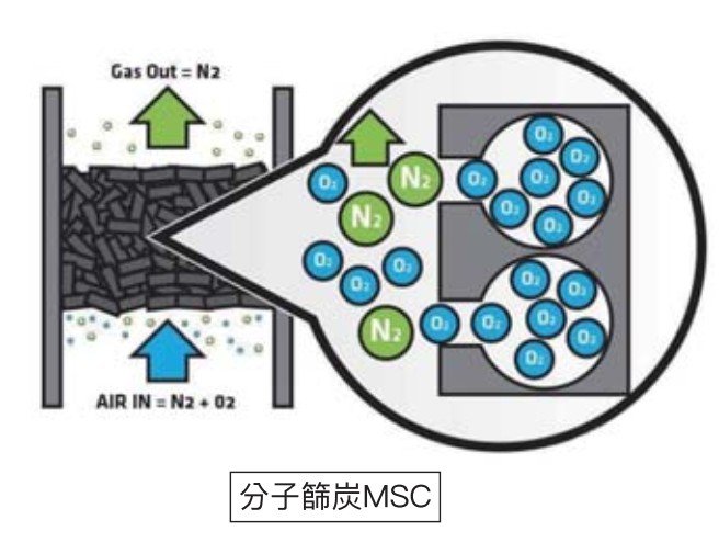 - Adsorption: Compressed air is fed into a vessel filled with CMS under high pressure. The CMS adsorbs oxygen molecules, moisture, and other gases, producing high-purity nitrogen gas that flows out.