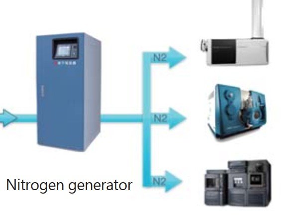 In laboratories, nitrogen generators are often connected directly to analytical instruments to supply nitrogen for their operation. Examples: