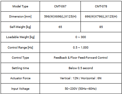 VAIS-CMT is a full active anti-vibration system incorporating 3 axis-6 degree of freedom control technology to eliminate pneumatic passive vibration isolator's resonance issue.
