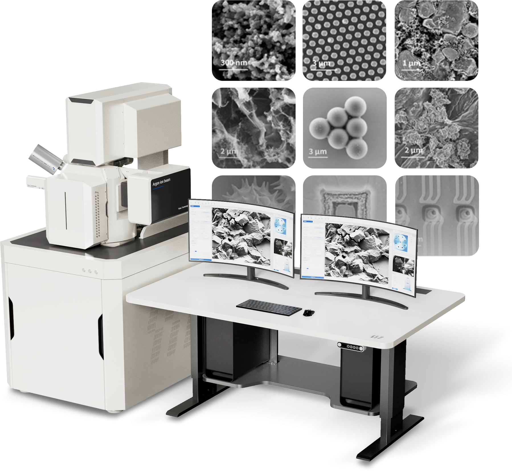 กล้องจุลทรรศน์อิเล็กตรอนแบบสแกนชนิดฟิลด์อิมิสชัน (FESEM) กล้องจุลทรรศน์นี้มีเทคโนโลยี Schottky FEG สำหรับการถ่ายภาพแรงดันต่ำความละเอียดสูง ประกอบด้วยตัวตรวจจับหลายตัวเพื่อจับภาพรายละเอียดสัณฐานวิทยาของตัวอย่าง การออกแบบแบบโมดูลาร์รองรับการกำหนดค่าแบบกำหนดเองและอุปกรณ์เสริมจากบริษัทอื่นหลายรายการสำหรับการถ่ายภาพและการวิเคราะห์ขั้นสูง ภาพแสดงอุปกรณ์ FESEM หลักและตัวอย่างภาพจากกล้องจุลทรรศน์ของตัวอย่างต่างๆ ที่กำลังขยายสูง