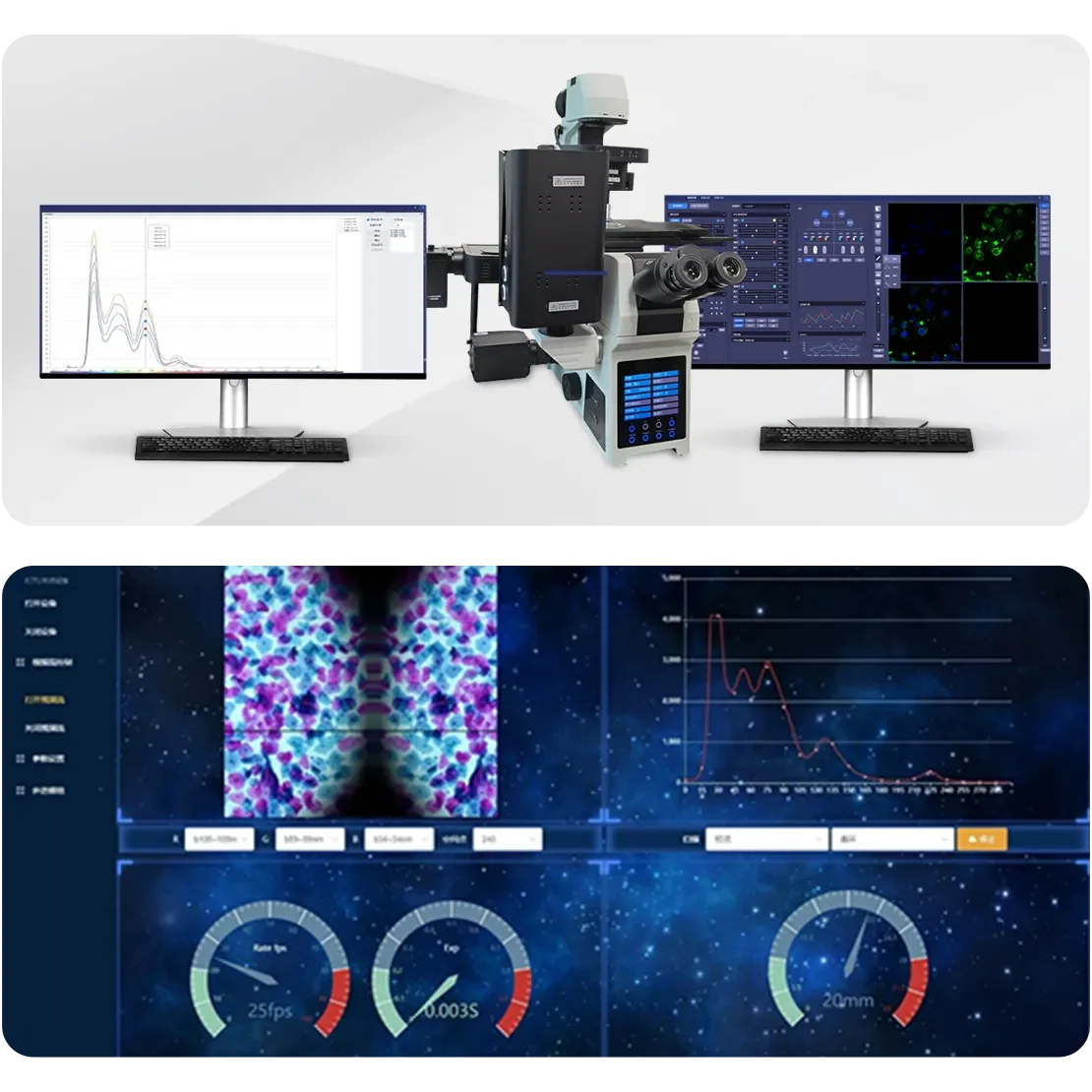ระบบกล้องจุลทรรศน์ไฮเปอร์สเปกตรัลระบบนี้ผสมผสานเทคโนโลยีไฮเปอร์สเปกตรัลกับการส่องกล้องจุลทรรศน์เพื่อจับภาพข้อมูลสเปกตรัมความละเอียดสูงและภาพลักษณะทางสัณฐานวิทยาของตัวอย่างทางชีวภาพ ระบบรวมความสามารถด้านการวิเคราะห์สเปกตรัมและการถ่ายภาพเข้าด้วยกันอย่างมีประสิทธิภาพภาพแสดงชุดกล้องจุลทรรศน์พร้อมจอภาพหลายจอที่แสดงข้อมูลสเปกตรัมและภาพตัวอย่างทางชีวภาพที่มีสีสันพร้อมแดชบอร์ดวิเคราะห์