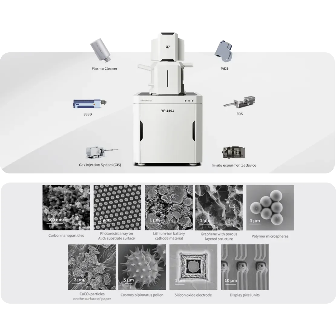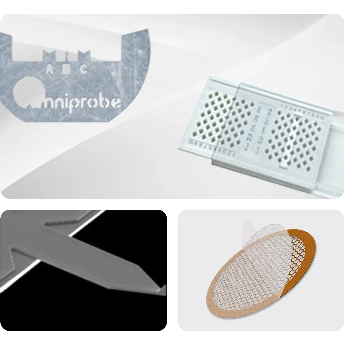 อุปกรณ์เสริมส่วนนี้แสดงอุปกรณ์เสริมต่างๆ ของ กล้องจุลทรรศน์ แบบต่างๆ รวมถึงซับสเตรต SERS, หัวโพรบ AFM, เทมเพลตรู, โพรบ QUS ความต้านทานสูง, หน้าต่างซิลิคอนไนไตรด์, ซับสเตรต AFM, โพรบไมโครเวฟ QUS และรีเอเจนต์เพิ่มสัญญาณรามานสำหรับการวัดและวิเคราะห์แบบละเอียด ภาพแสดงที่ใส่ตัวอย่างต่างๆ, ปลายโพรบ และเทมเพลตตาข่ายที่ใช้กับเครื่องมือหลัก